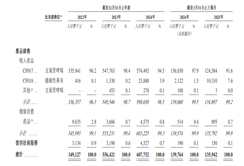 长风药业严重依赖CF017的销售,2022年至2024年以及2025年第一季度,该产品分别占当期总收益的96.2%、98.4%、94.5%及91.6%。据弗若斯特沙利文资料,按销量计,CF017占2024年中国布地奈德吸入药物市场约16%。也是在CF017的推动下,2022年至2024年,长风药业分别实现收入3.49亿元、5.56亿元和6.08亿元,年复合增长率达到31.9%。反映在利润上,2022年的长风药业仍处于亏损状态,期内亏损为4939.9万元,2023年扭亏为盈,2023年、2024年期内利润为3172.6万元和2108.8万元。2025年第一季度,长风药业实现收入1.36亿元,期内实现利润1281.5万元。