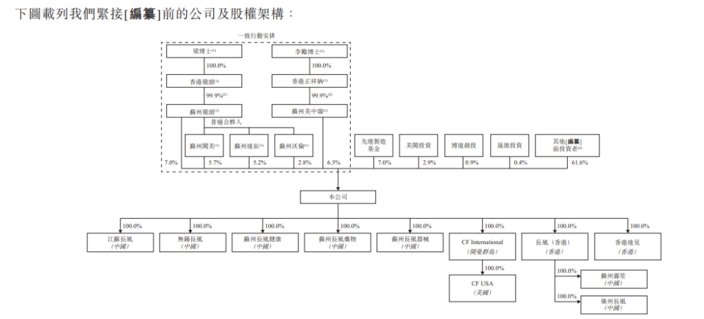 在港股上市前,长风药业经历多轮融资。截至最后实际可行日期,梁文青(通过香港岭头、苏州岭头、苏州闽美、苏州远辰及苏州沃伦)及李励(通过香港正祥纳及苏州美中瑞)合计持有本公司 27.2%股权。
